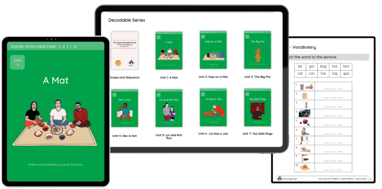 Our decodable books follow the Sounds-Write scope and sequence, a systematic synthetic phonics program by John Walker (UK). Selected with ESL learners in mind, it carefully manages cognitive overload through a clear, scaffolded approach. This scope and sequence includes the Initial Code, Extended Code and Polysyllabic Words. ESL Reads is currently developing the Initial Code.